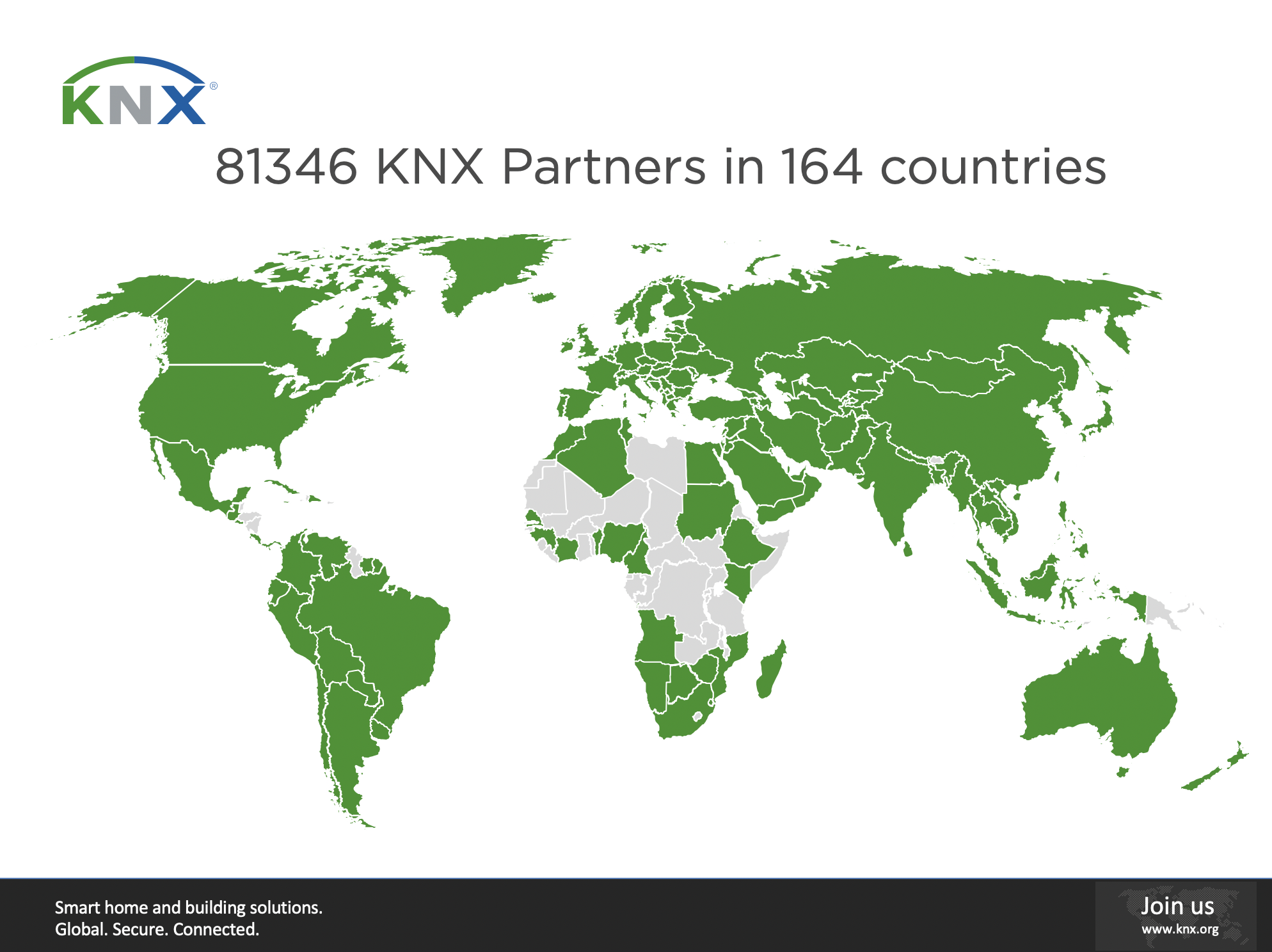 전 세계의 주택 및 빌딩 제어 분야에서 KNX를 이용하고 있습니다. 수백만의 KNX 설비가 유럽 뿐만 아니라 아시아 및 미주 등에서 사용되고 있는 현환을 통해, KNX 식 접근법의 장점을 손쉽게 살펴볼 수 있습니다. 현재 전 세계적으로 400여 곳이 넘는 KNX 회원사들이 KNX 인증을 받은 7,000여 종의 다양한 애플리 케이션 도메인 제품군을 제공하고 있습니다. 현재 190여 개 국가 내의 설립된 협회, 70,000여 곳의 파트너 업 체들, 400여 곳의 글로벌 KNX 트레이닝 센터가 함께 하고 있습니다.