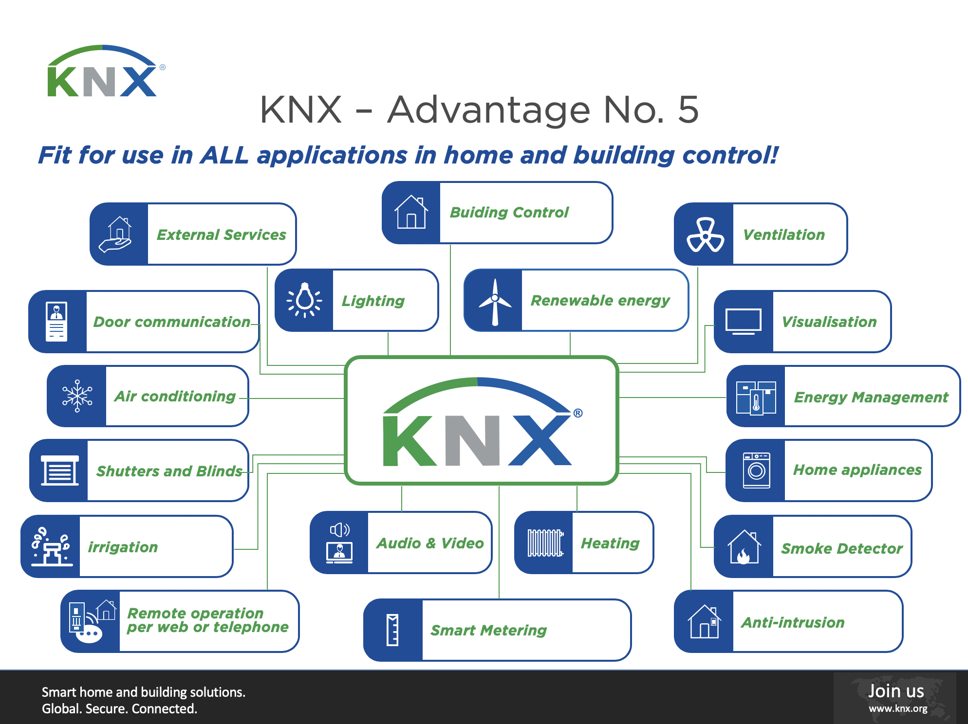 주택에서 사무용 건물, 그리고 상업용 건물에 이르기까지 KNX는 빌딩 자동제어를 통하여 완전히 새로운 설루션들을 다양하게 사용할 수 있는 기회를 제공하는 동시에, 이를 합리적인 비용으로 누릴 수 있습니다. KNX는 하나의 터치 패널만으로 모든 주택 및 건물용 애플리케이션을 제어할 수 있습니다. 조명 및 블라인드/셔터 제어에서부터 냉난방/환기 등의 공조, 수위 제어, 동작/재실 감지를 통한 출입 제어 및 기타 보안/알람 시스템, 오디오/비디오 시스템, 스마트 미터링을 포함한 에너지 절감 및 그 외 기타 가정용품 원격제어에 이르기까지 다양한 기능들을 지원하면서 안락함과 안전성, 에너지 절감 및 효율성 등 사용자 편의성을 최대한 보장해드리고 있습니다.