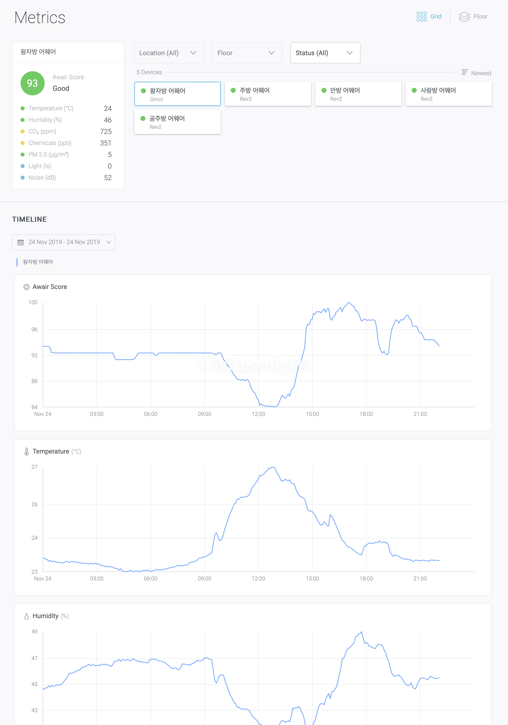 공기 관리 솔루션 어웨어 옴니 대시보드 (Awair Omni Dashboard).