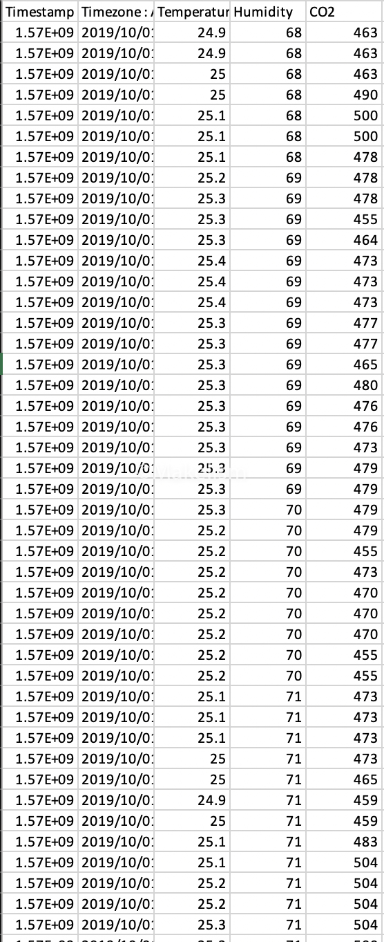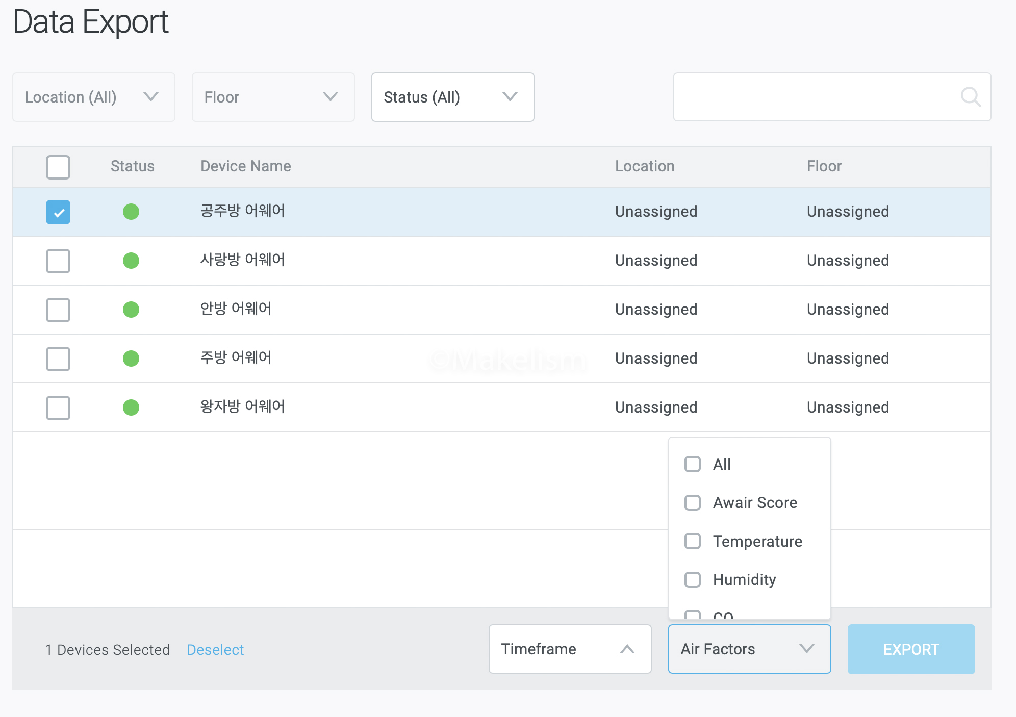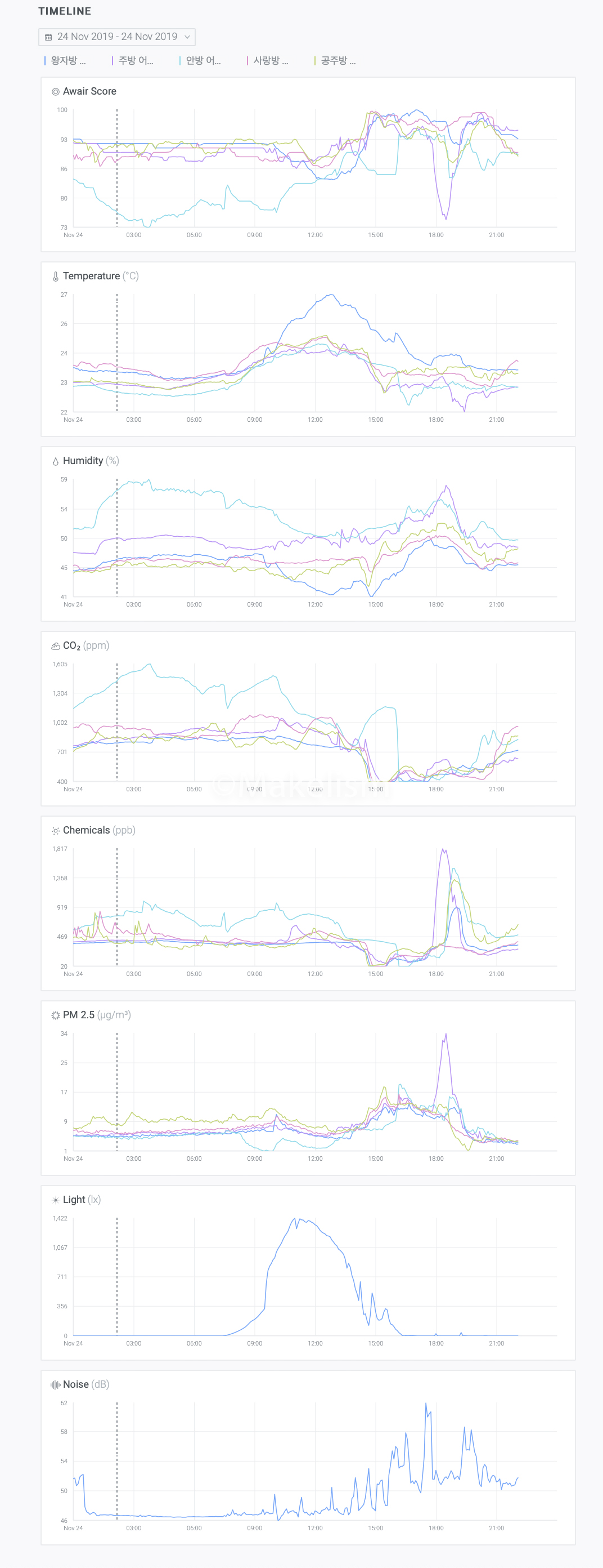 설치된 장치 하나의 데이터(온도, 습도, 이산화탄소, 휘발성 유기화합물, 초미세먼지, 조도, 소음)를.