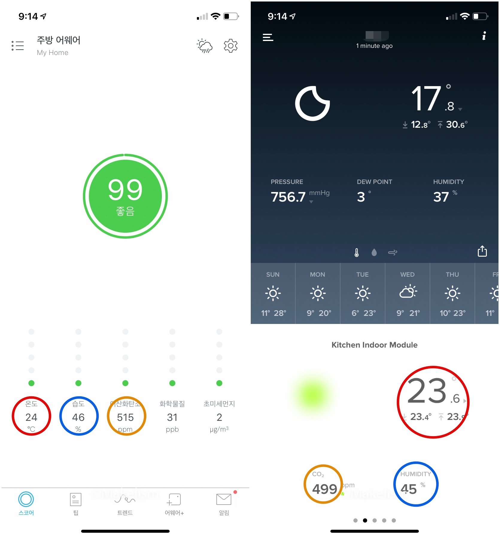 온도, 습도, 이산화탄소가 두 제품의 오차 범위 안에 있고. (아래)
