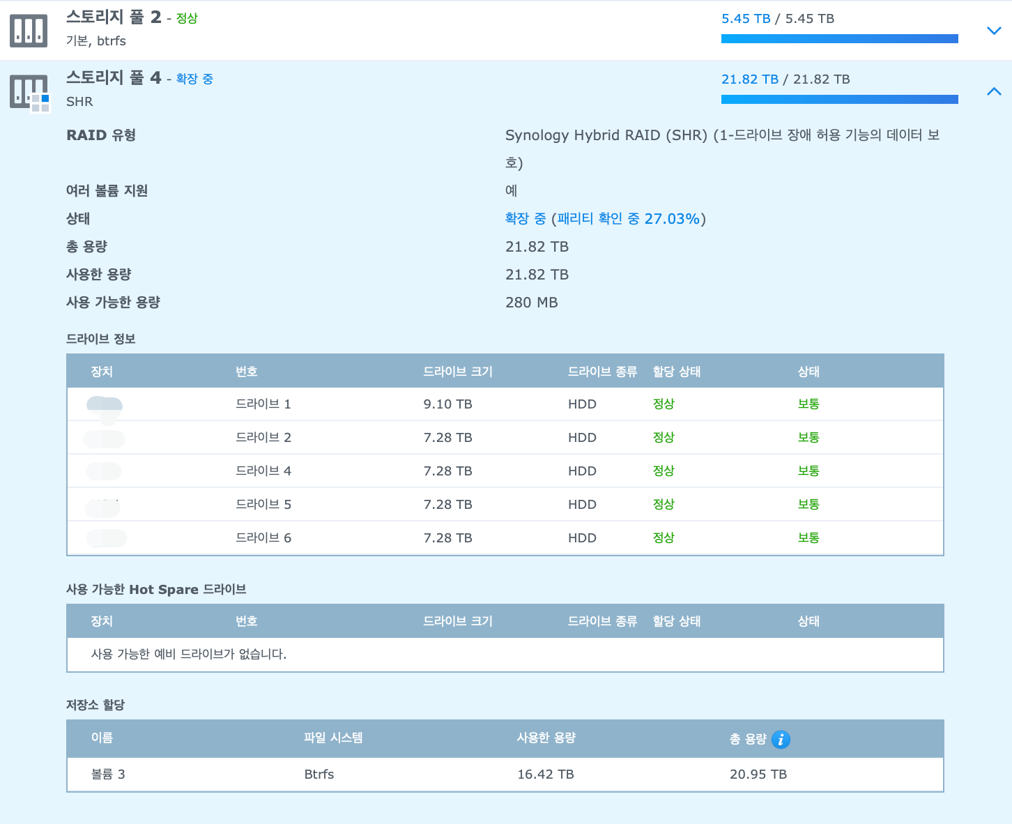 10TB 2개, 8TB 4개를 SHR로 묶어 하나의 볼륨을 생성할 계획이었으나.