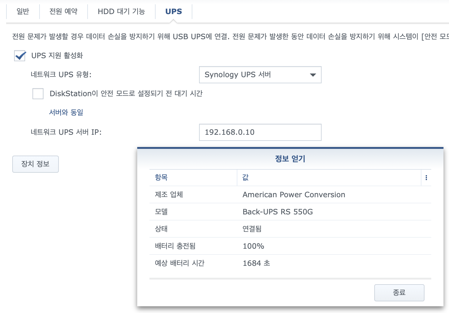 네트워크 UPS 지원을 활성화해. (아래)