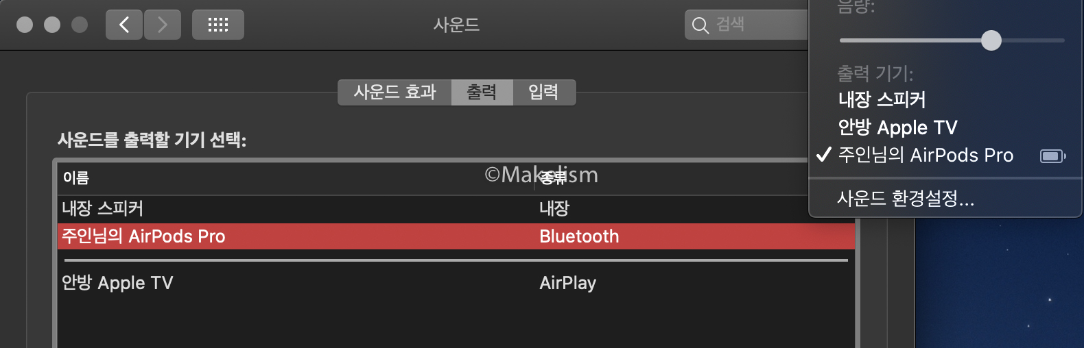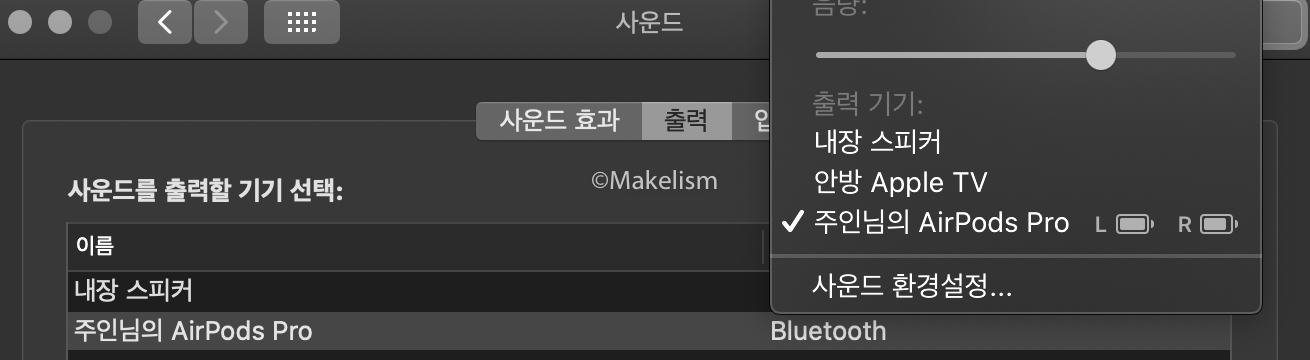 왼쪽, 오른쪽 에어팟의 길게 누르기 버튼 할당과.