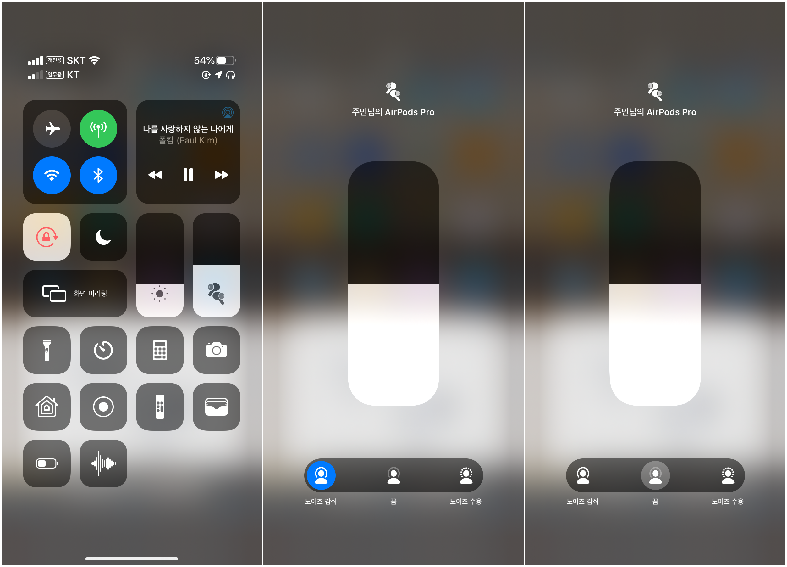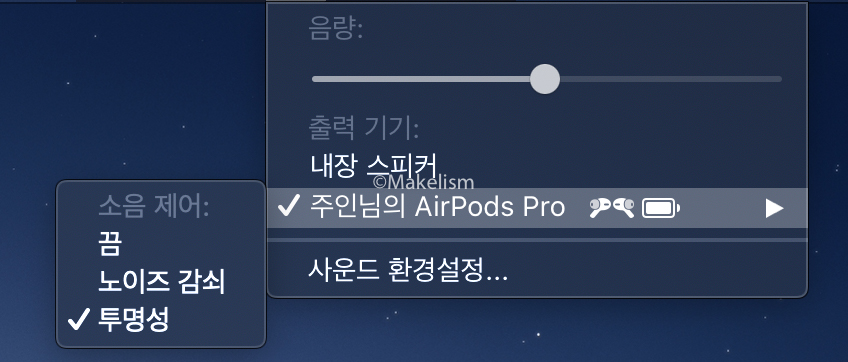노이즈 캔슬링 (감쇠, 투명도 기능) 전환 방법. (아래)