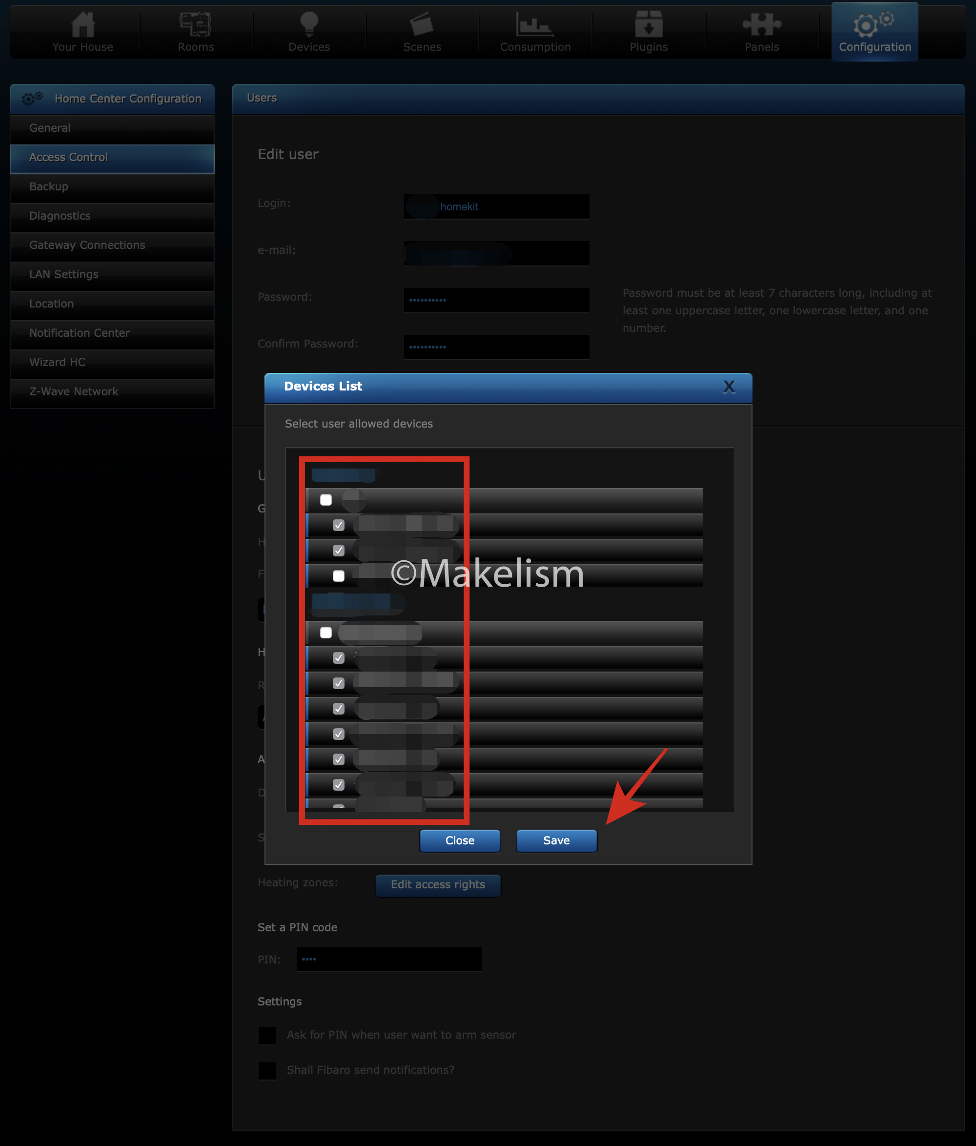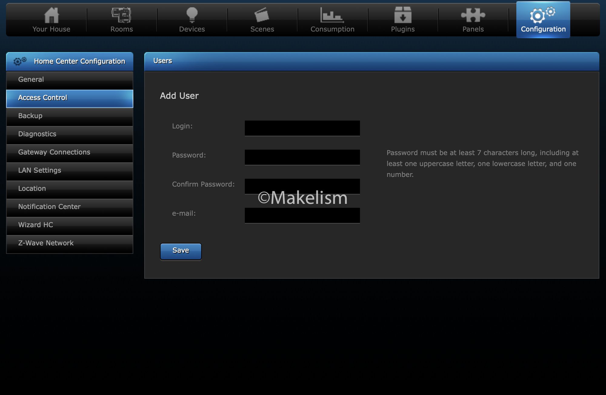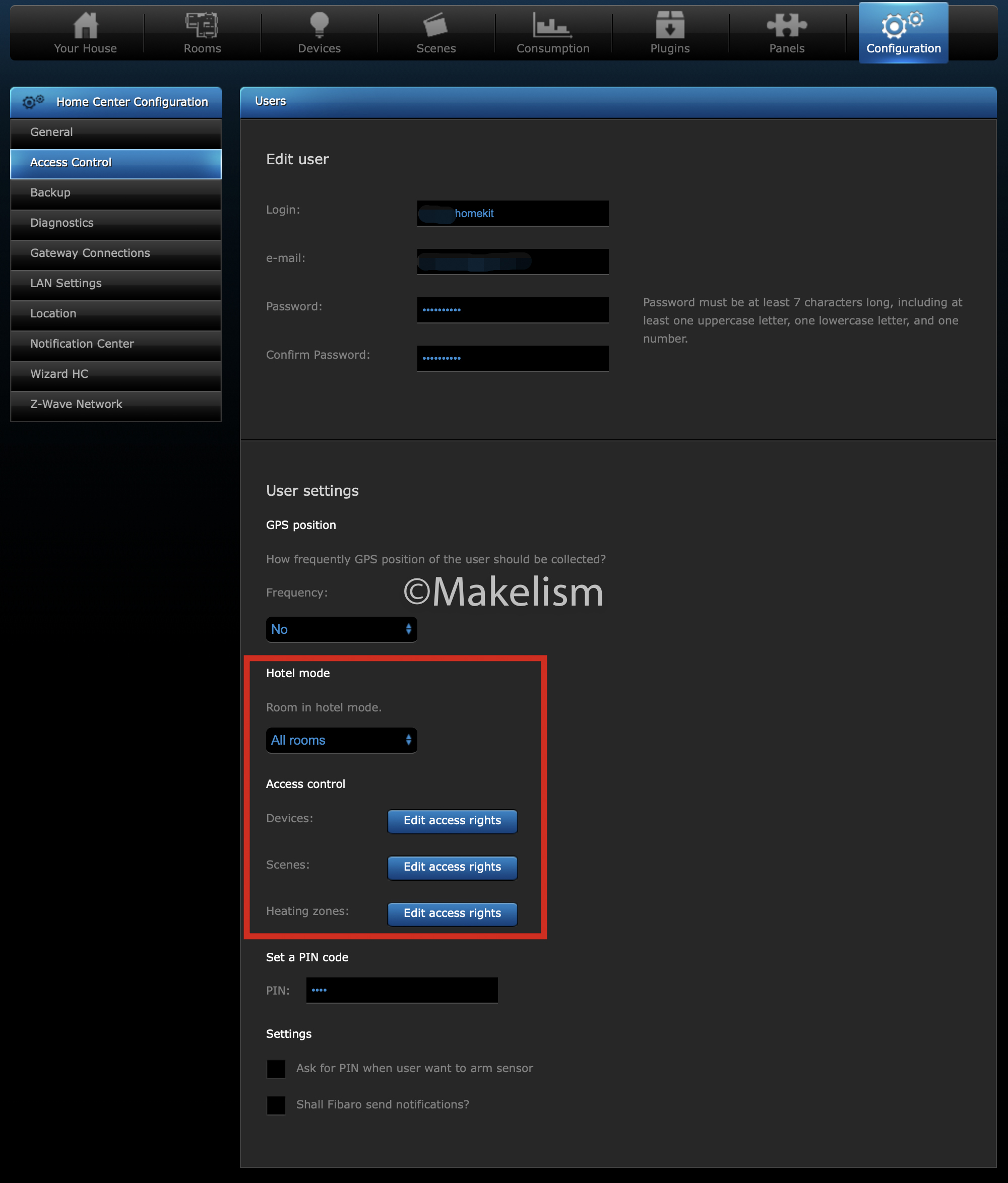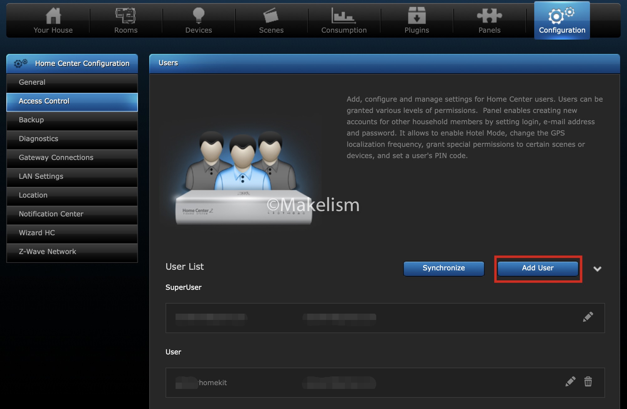 'Home Center - Configuration - Access Control'로 이동해서.