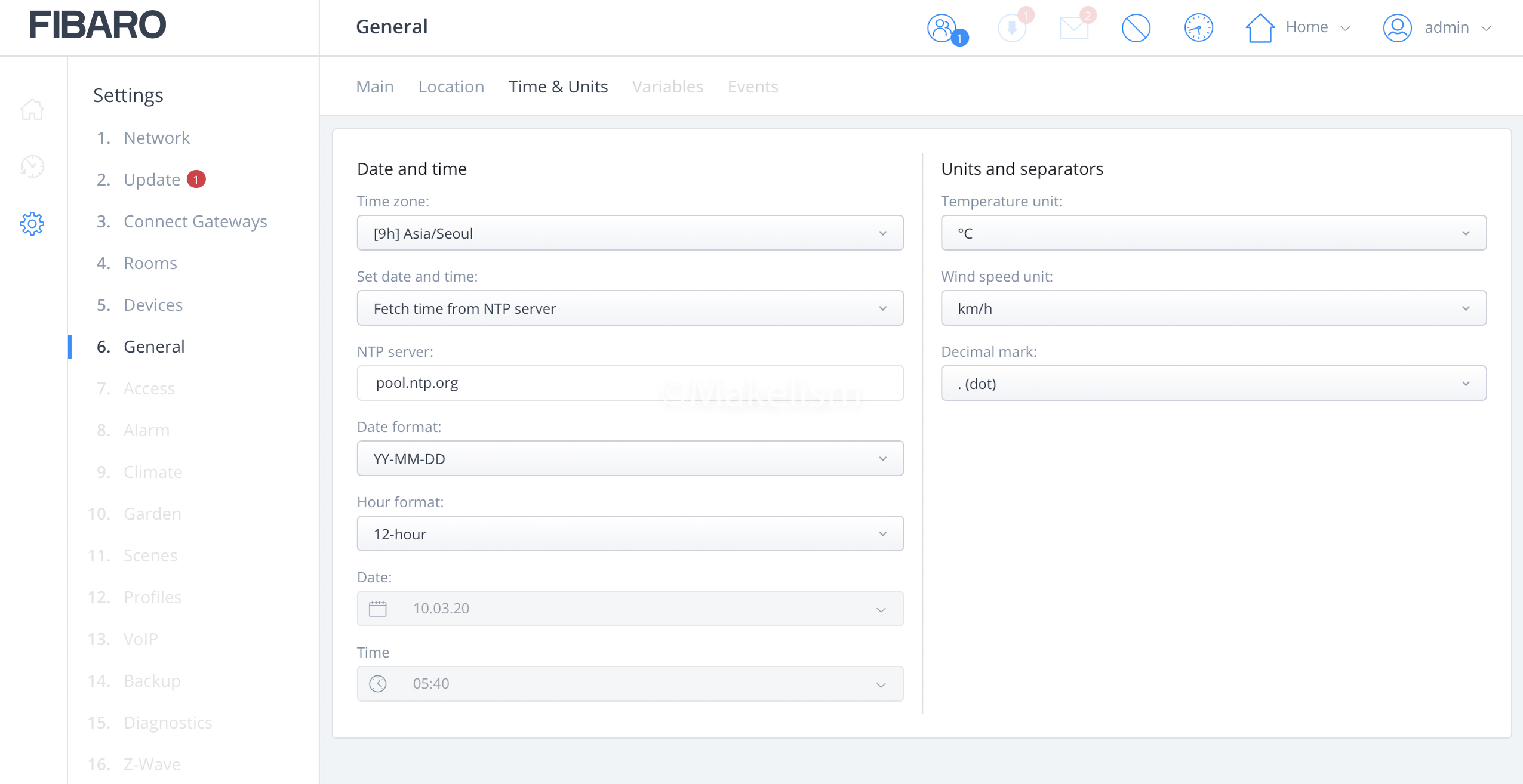 HC3 정보, 위치, 시간 등을 설정할 수 있는 항목.