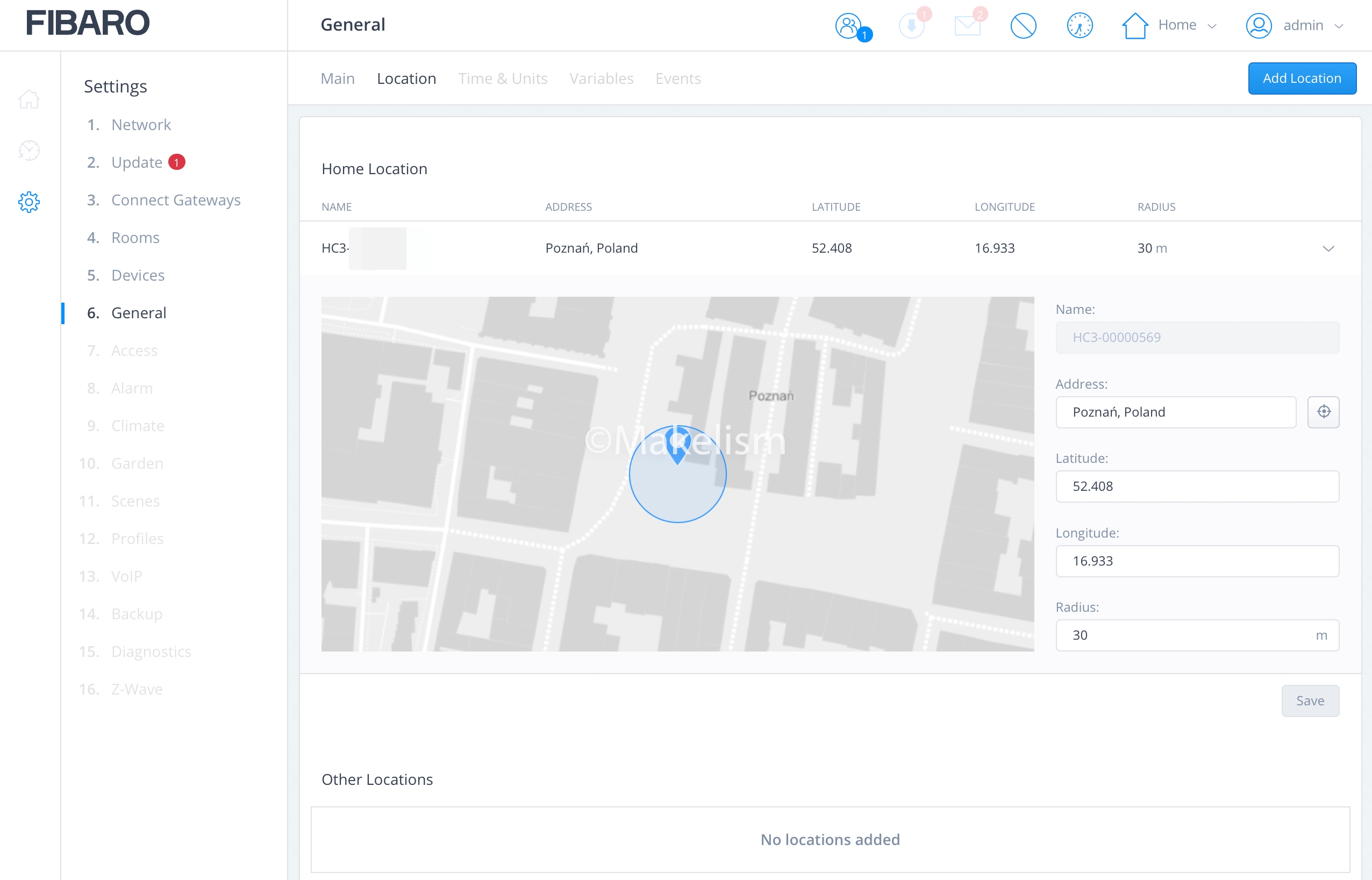 HC3의 위치와 지오펜스 반경을 설정할 수 있다.
