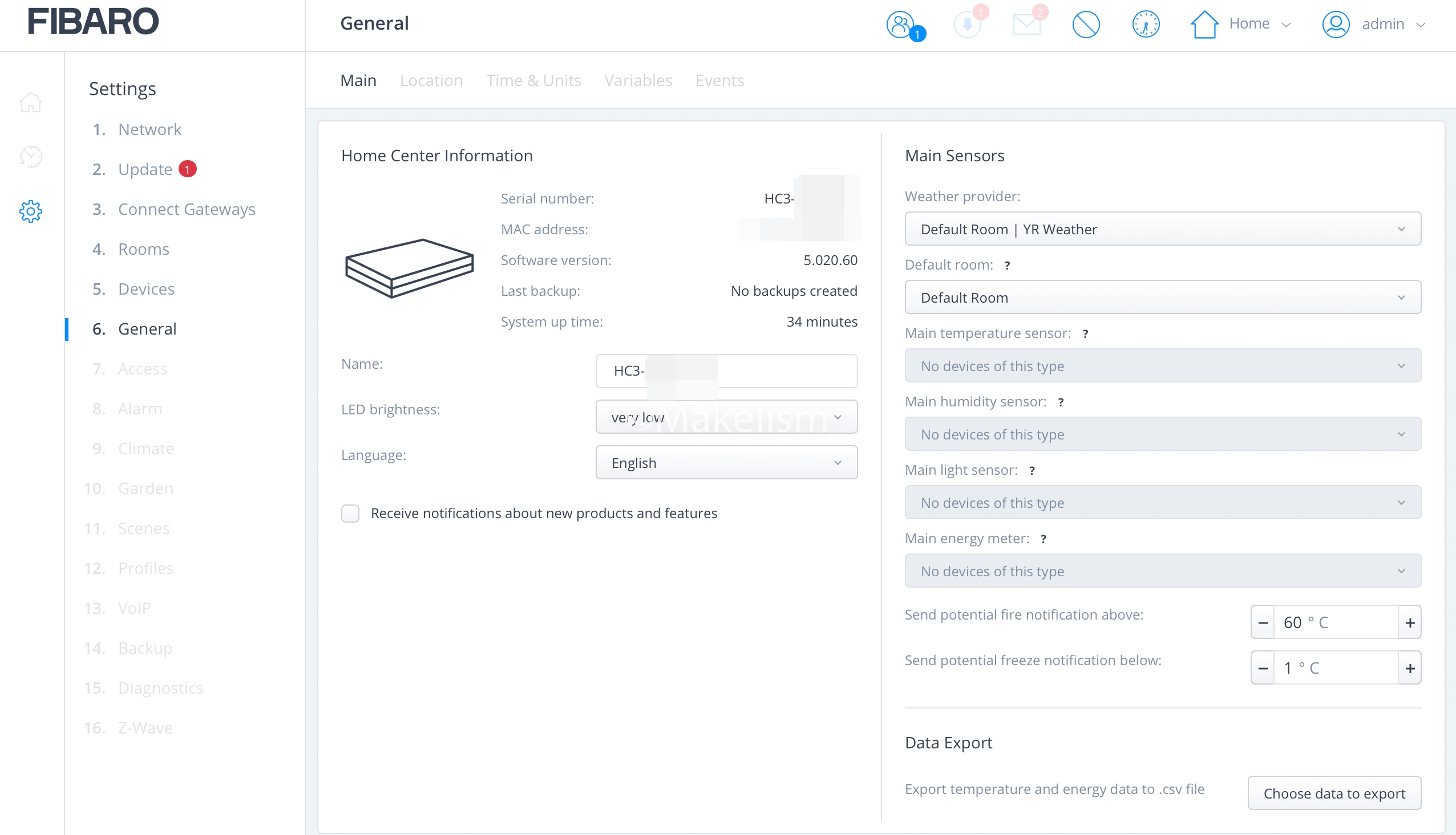 HC3 정보, 위치, 시간 등을 설정할 수 있는 항목.