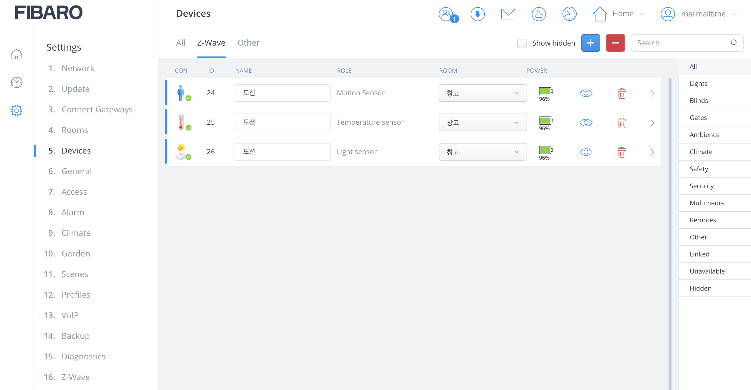 HC3에 연결한(할) 장치들을 편집, 추가, 삭제할 수 있는 항목.