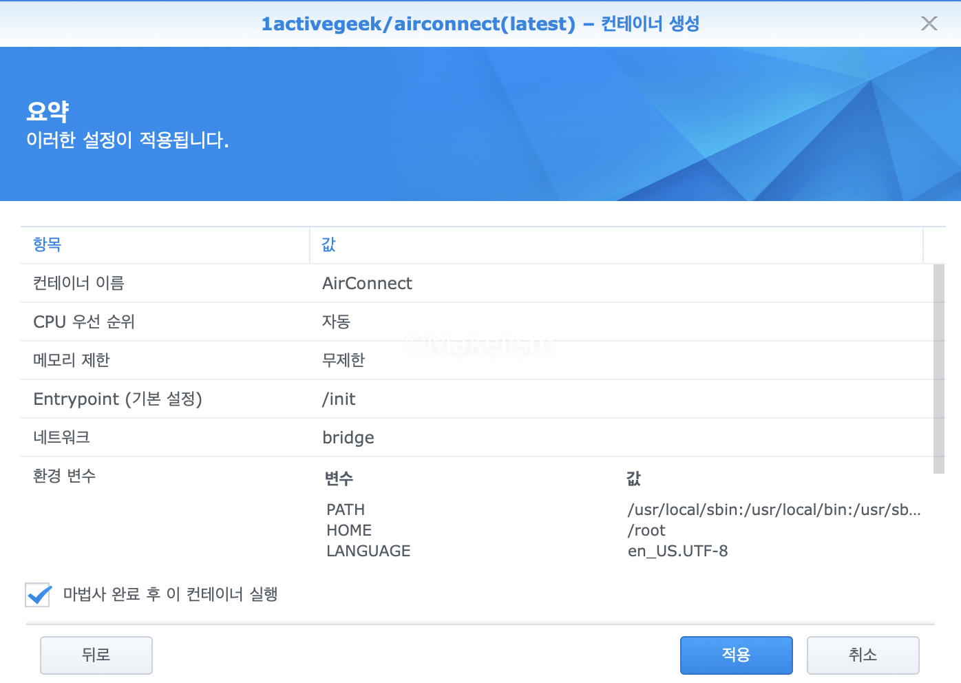 '마법사 완료 후 이 컨테이너 실행' 체크를 확인하고.