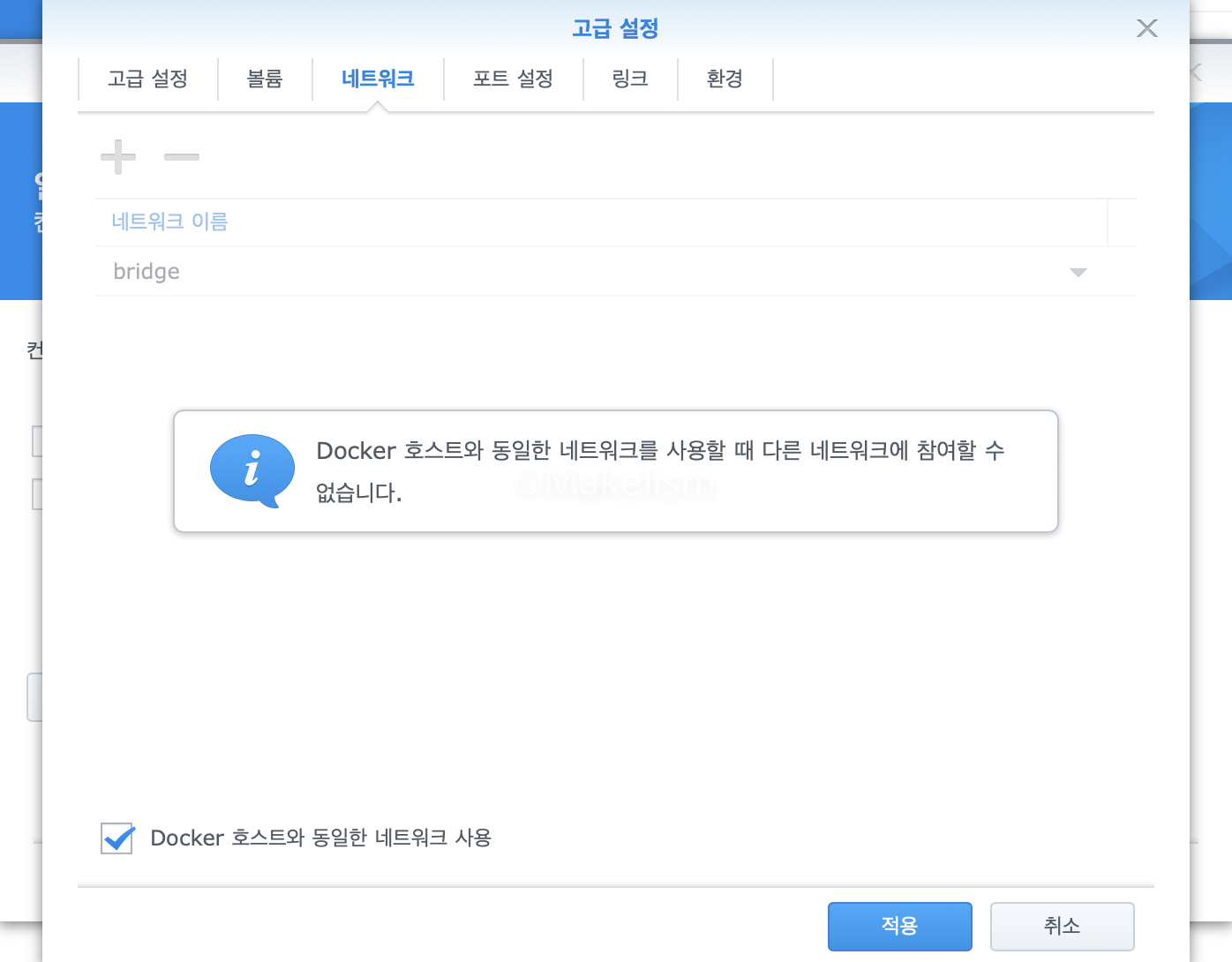 'Docker 호스트와 동일한 네트워크 사용' 체크 후.